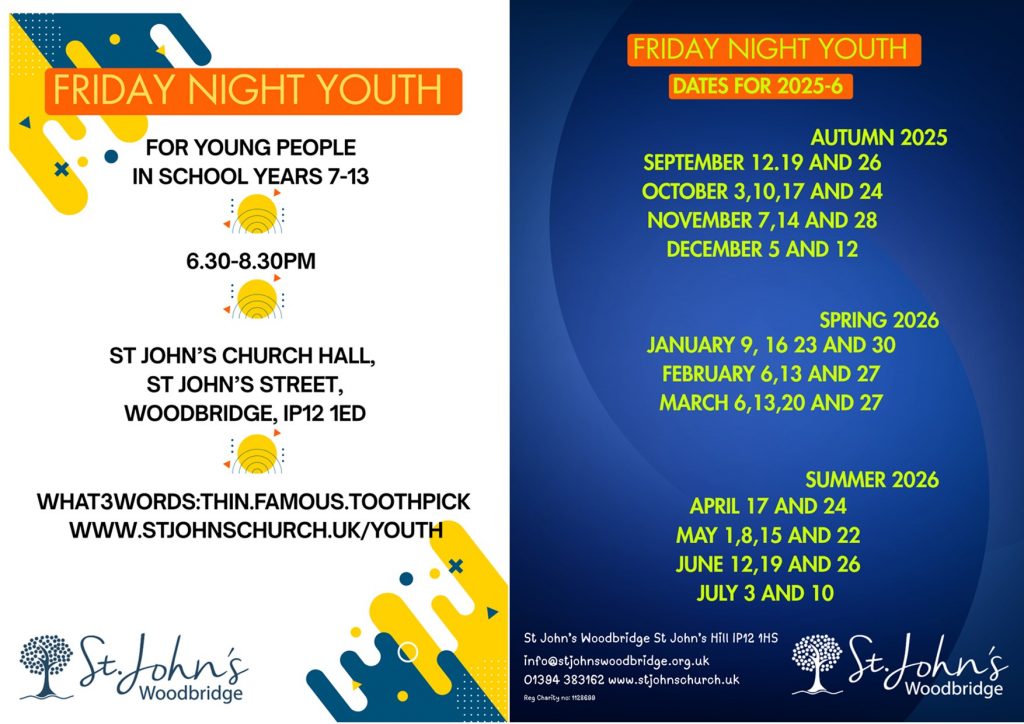 Friday Night Youth is for anyone in school years 7-13, meeting on Fridays during term time at St John’s Church Hall 6:30pm-8:30pm. Come and join us for games, try your hand at table tennis, table football, make some food, be creative, or just chill. You will be welcome whether you come on your own or bring a friend.